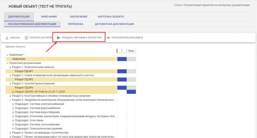 После загрузки документации в правом верхнем углу необходимо нажать "Изменить статус" -> "Передать в экспертизу".